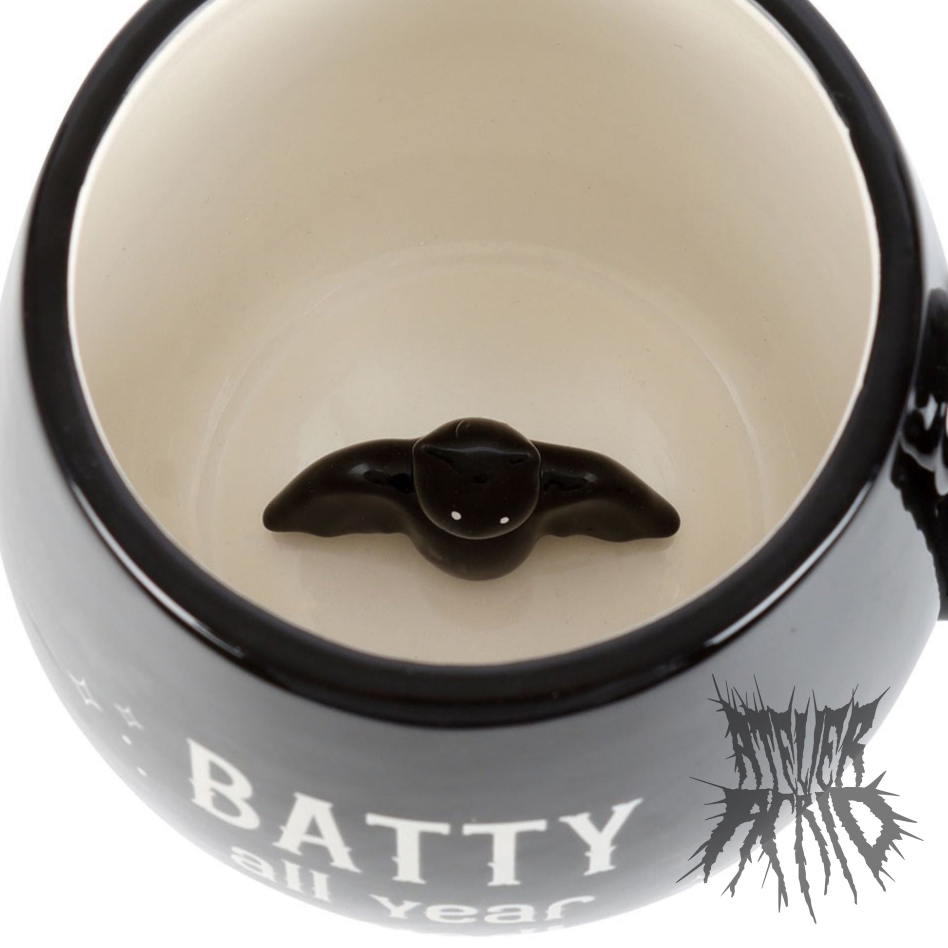 Feeling a bit batty? This fun peekaboo mug is sure to show off your dark and quirky personality with a special hidden surprise! Features 'Batty all year round' text on a black base and a charming 3D bat interior to start (or end) your day with a smirk. 500ml capacity. Do not microwave. Handwash only.