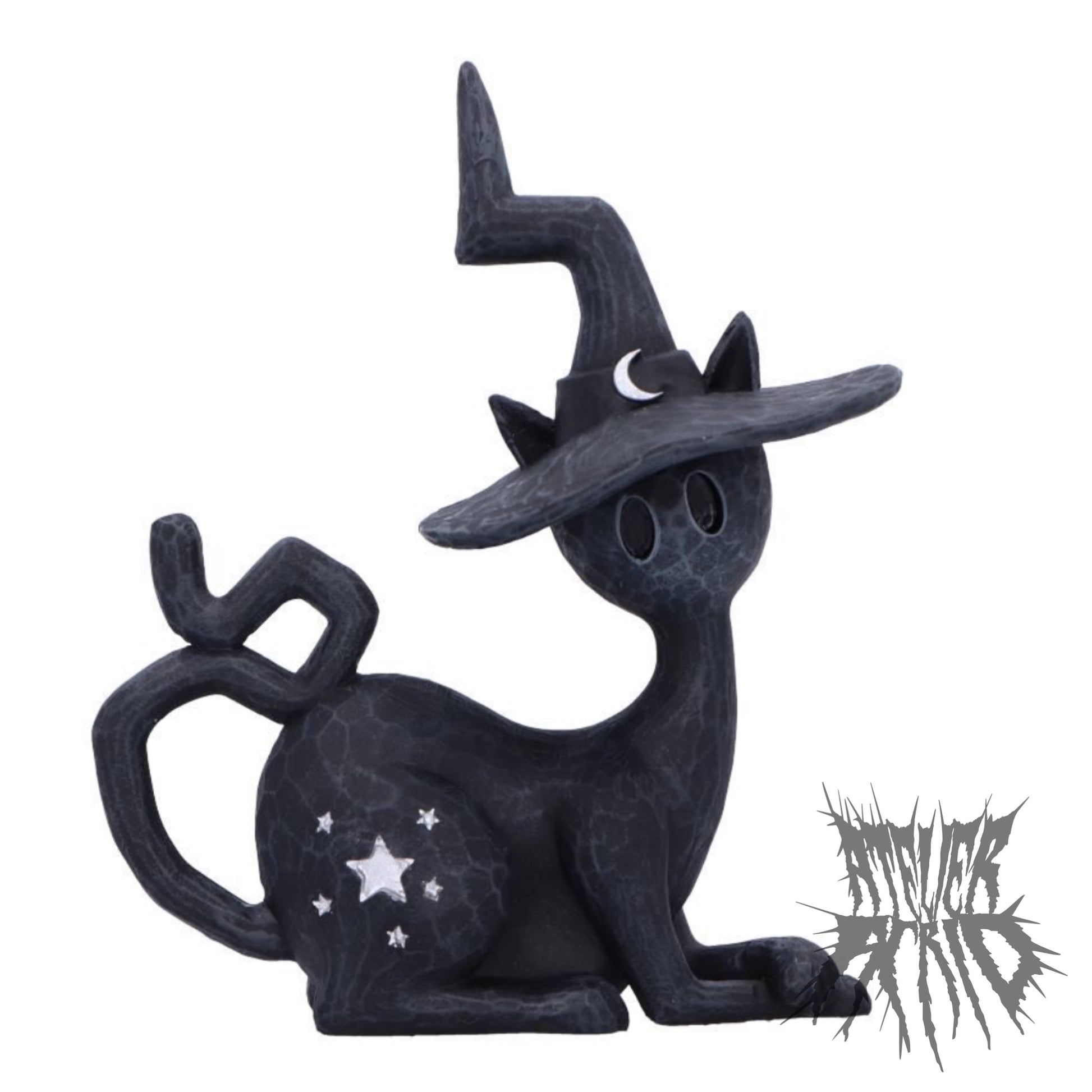 Hand-painted black with silver details, a curled tail, and a uniquely designed witch's hat, all crafted in high-quality resin for a premium finish.