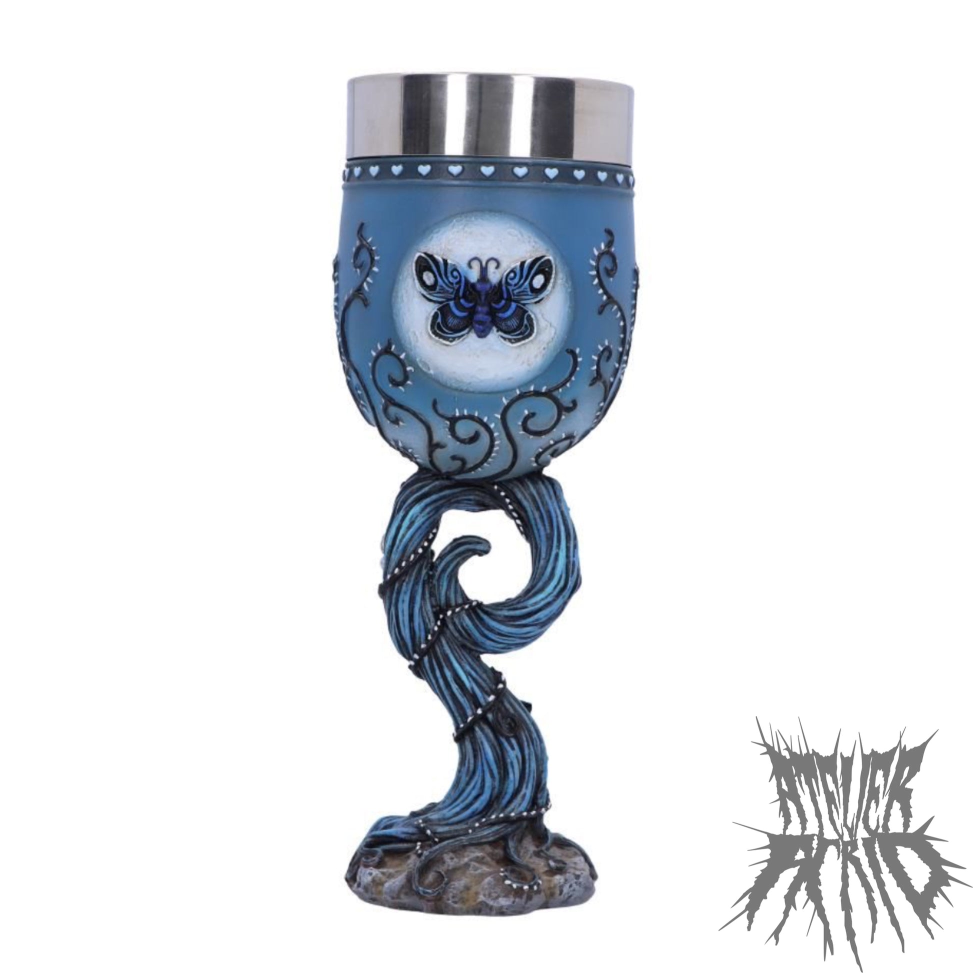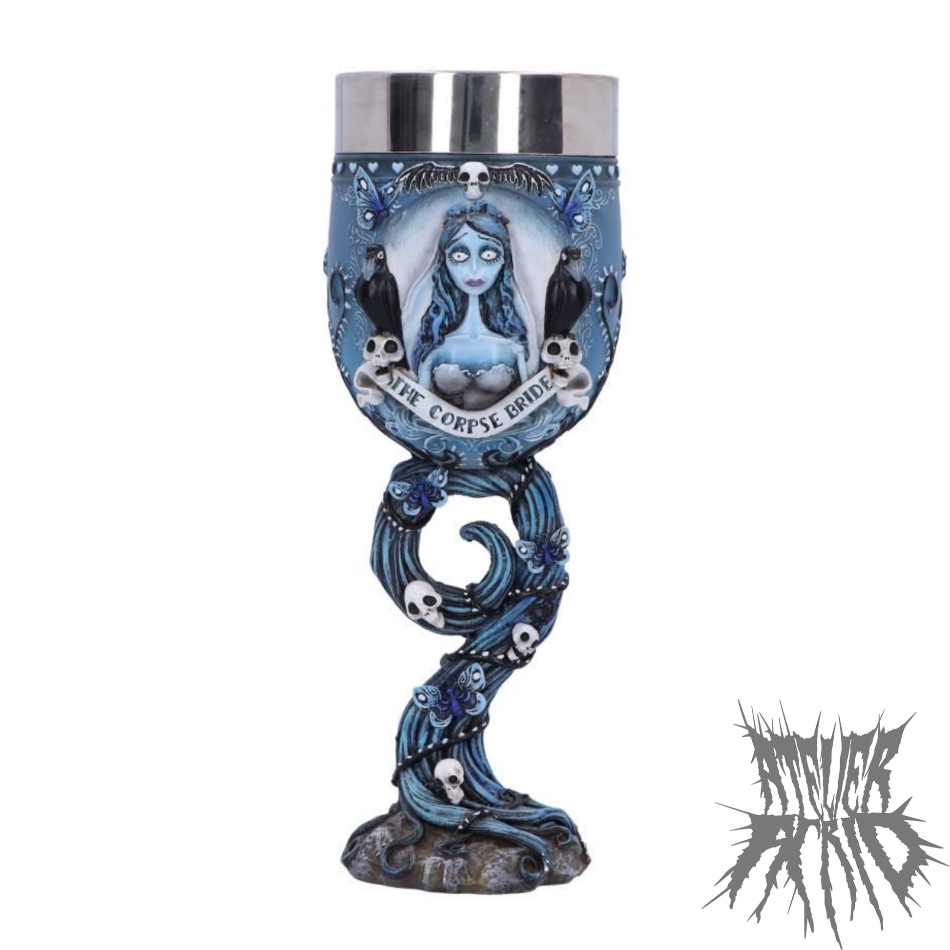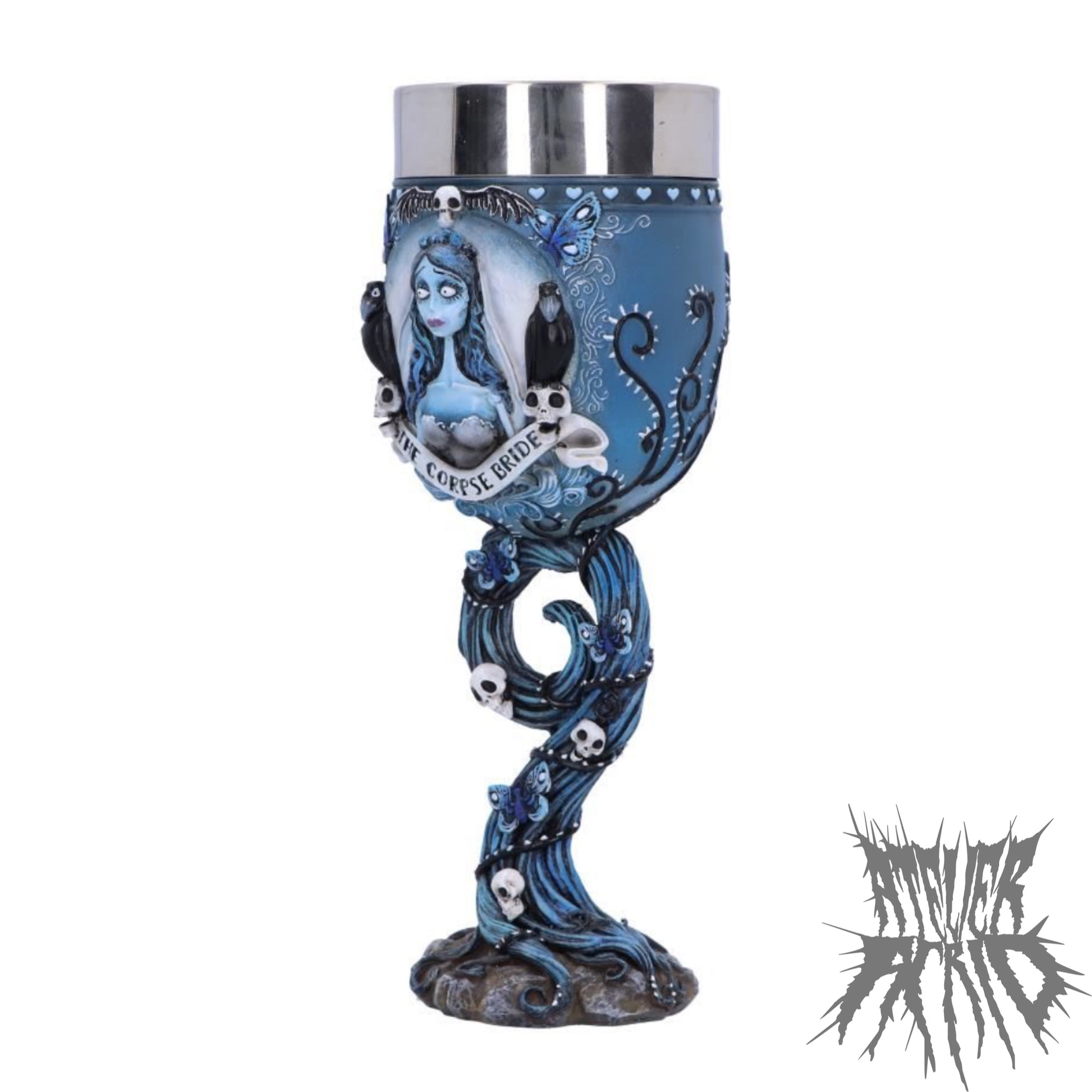 Discover the land of the dead with Nemesis Now's Officially Licensed Corpse Bride Goblet. Between two crows, Emily, the Corpse Bride, emerges from the front of the goblet wearing her iconic torn wedding dress and veil. While on the back and amongst the winding upturned root, which acts as the stem of the goblet, are multiple blue butterflies and skulls. Cast in the finest resin before being delicately hand-painted, this piece is perfect for any lover of the classic Tim Burton movie.