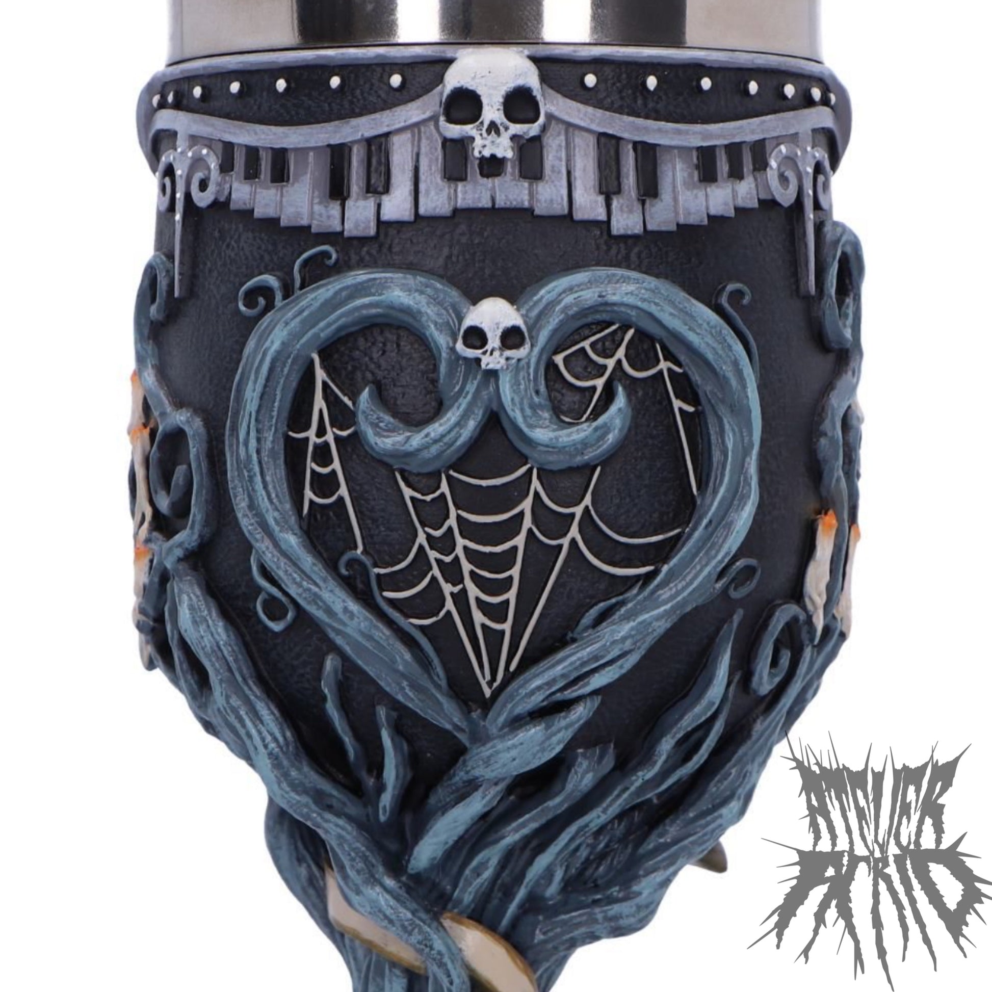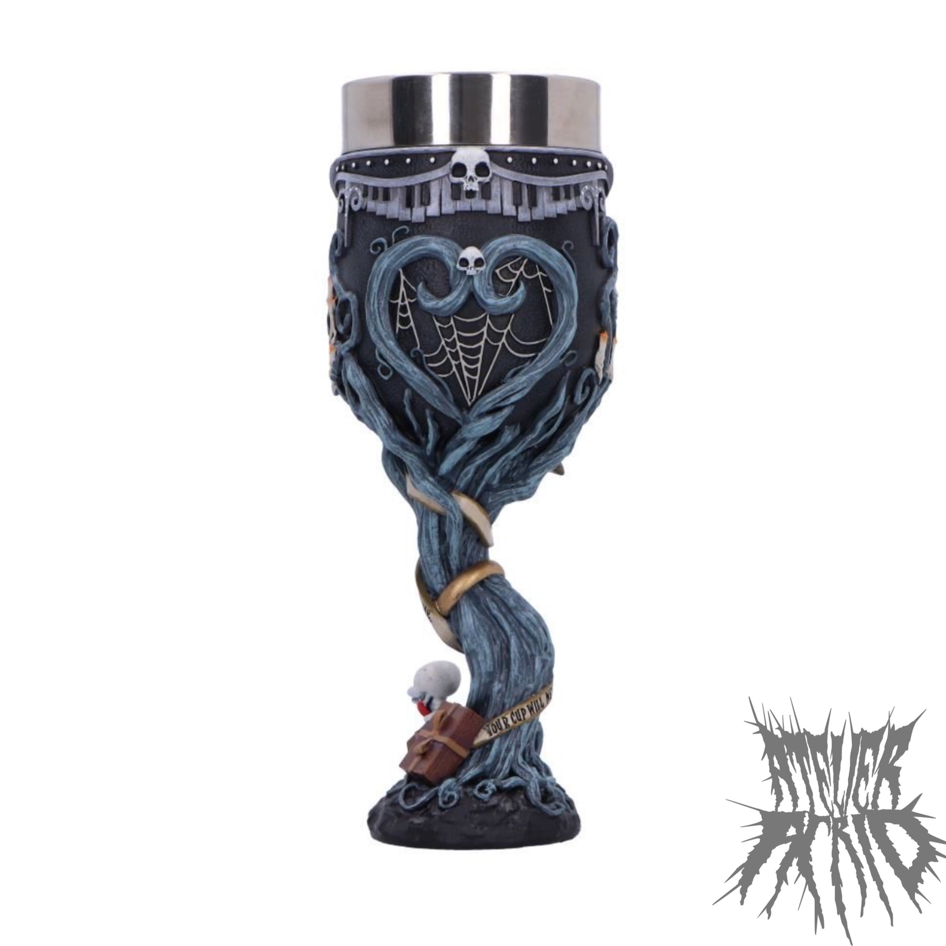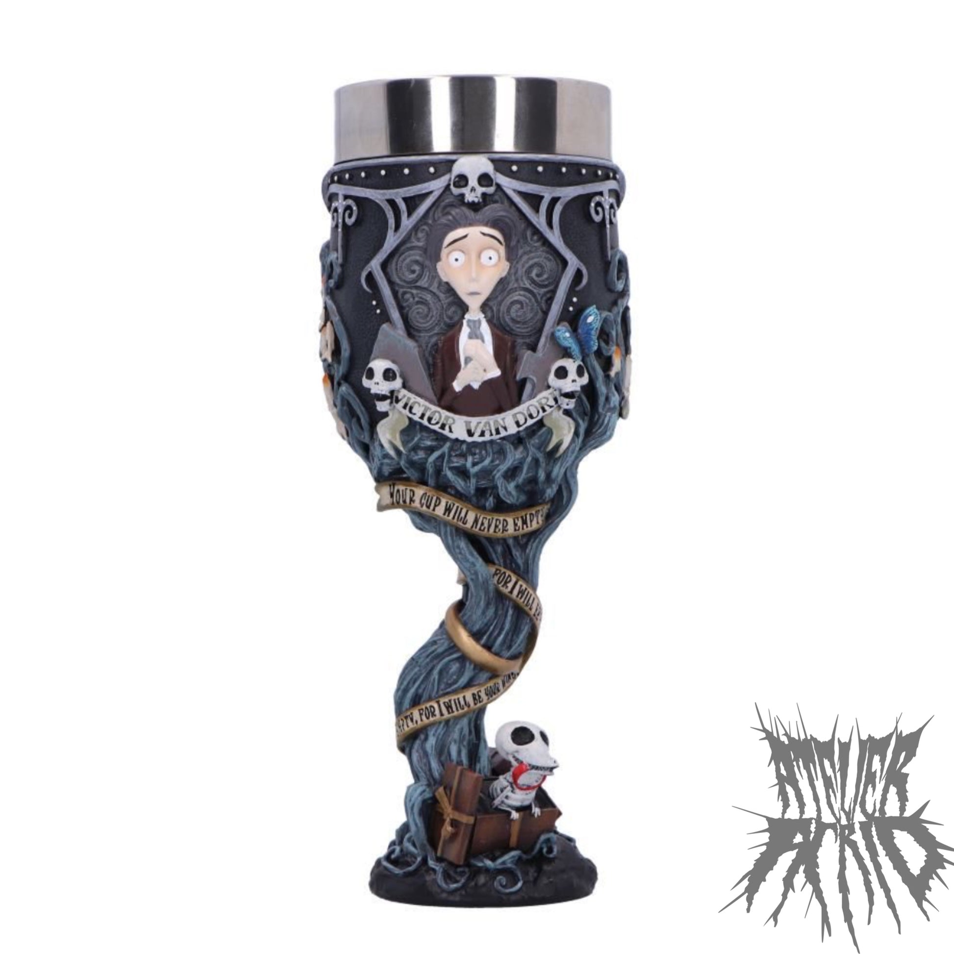 This intricately designed goblet features pale blue branchlike motifs winding around the cup, delicate spider webs, and candles that bring the world of the Corpse Bride to life. A portrait of Victor sits prominently on one side, with his vows spiraling around the twisted handle. The base showcases Scraps joyfully popping out of a gift box, a playful and nostalgic finishing touch.