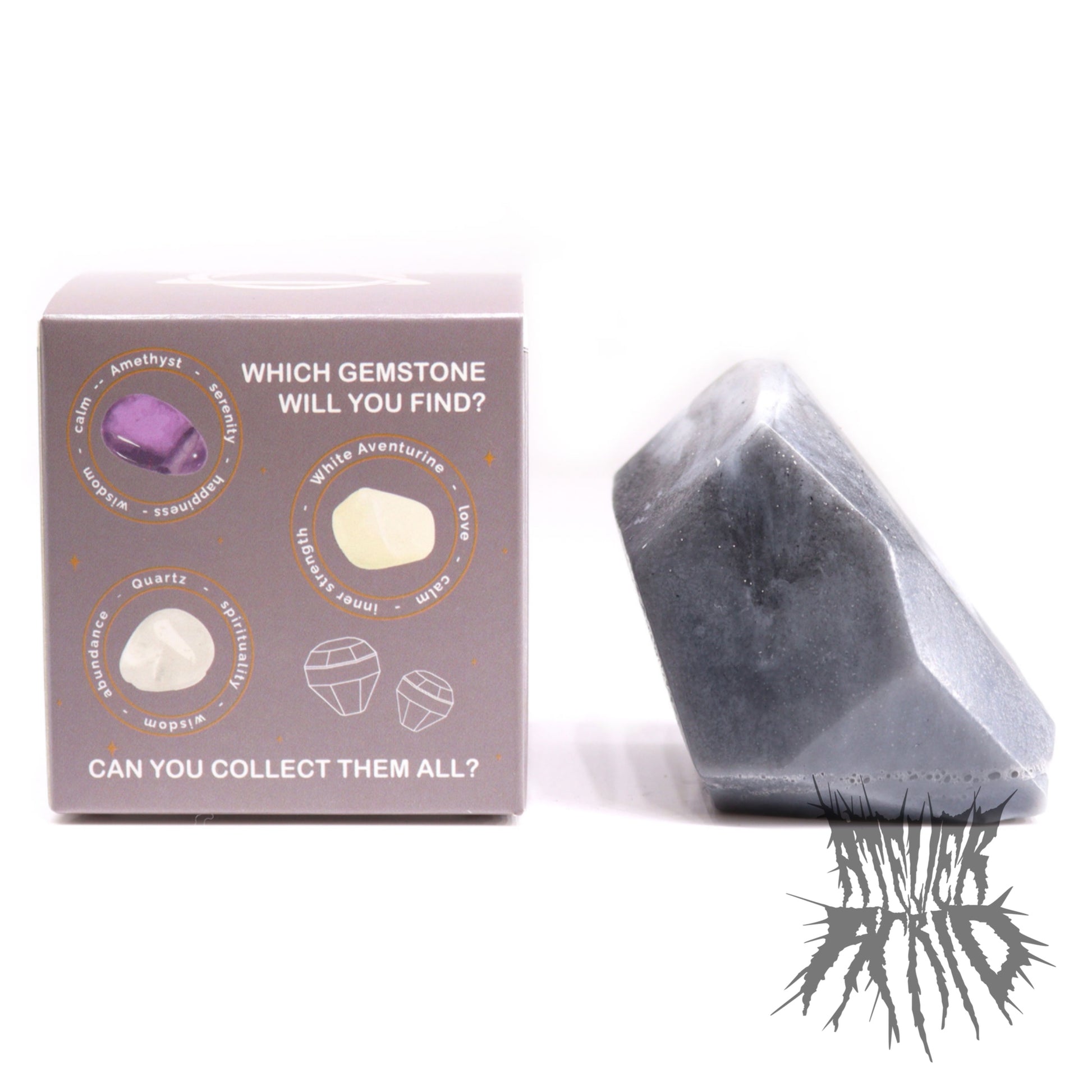 with a surprise air-element gemstone in each soap! Each bar features one of three powerful crystals: calming amethyst, positive white aventurine, or clear quartz for amplification.
