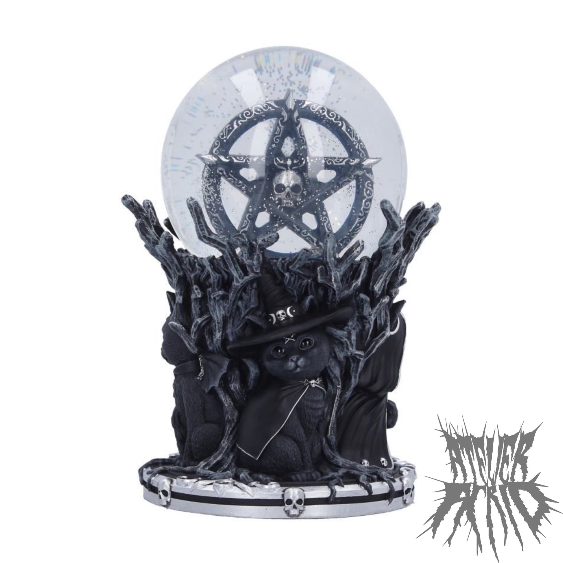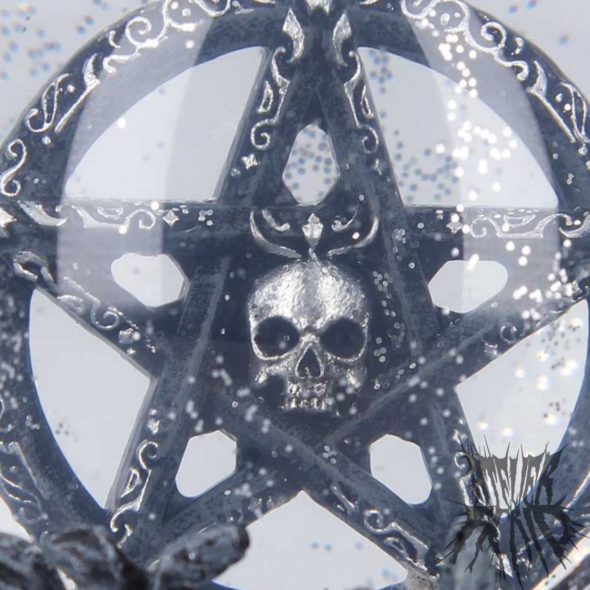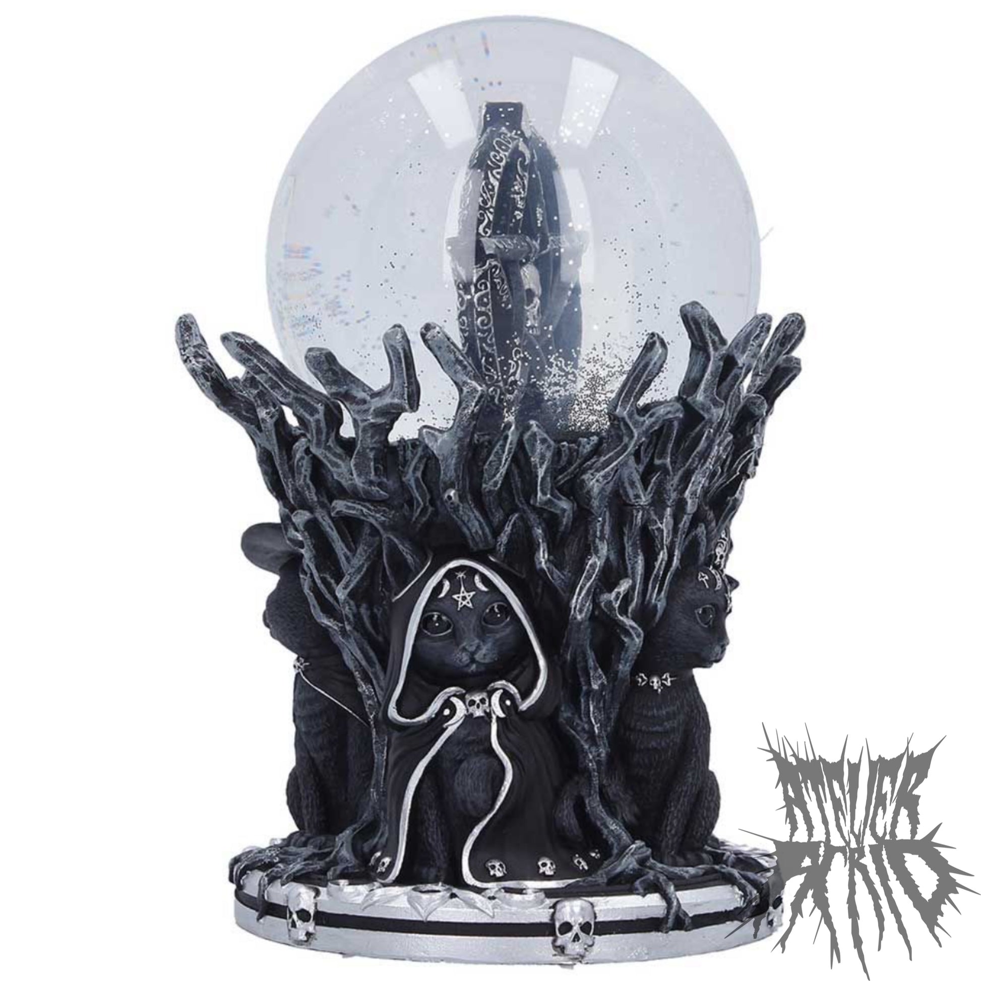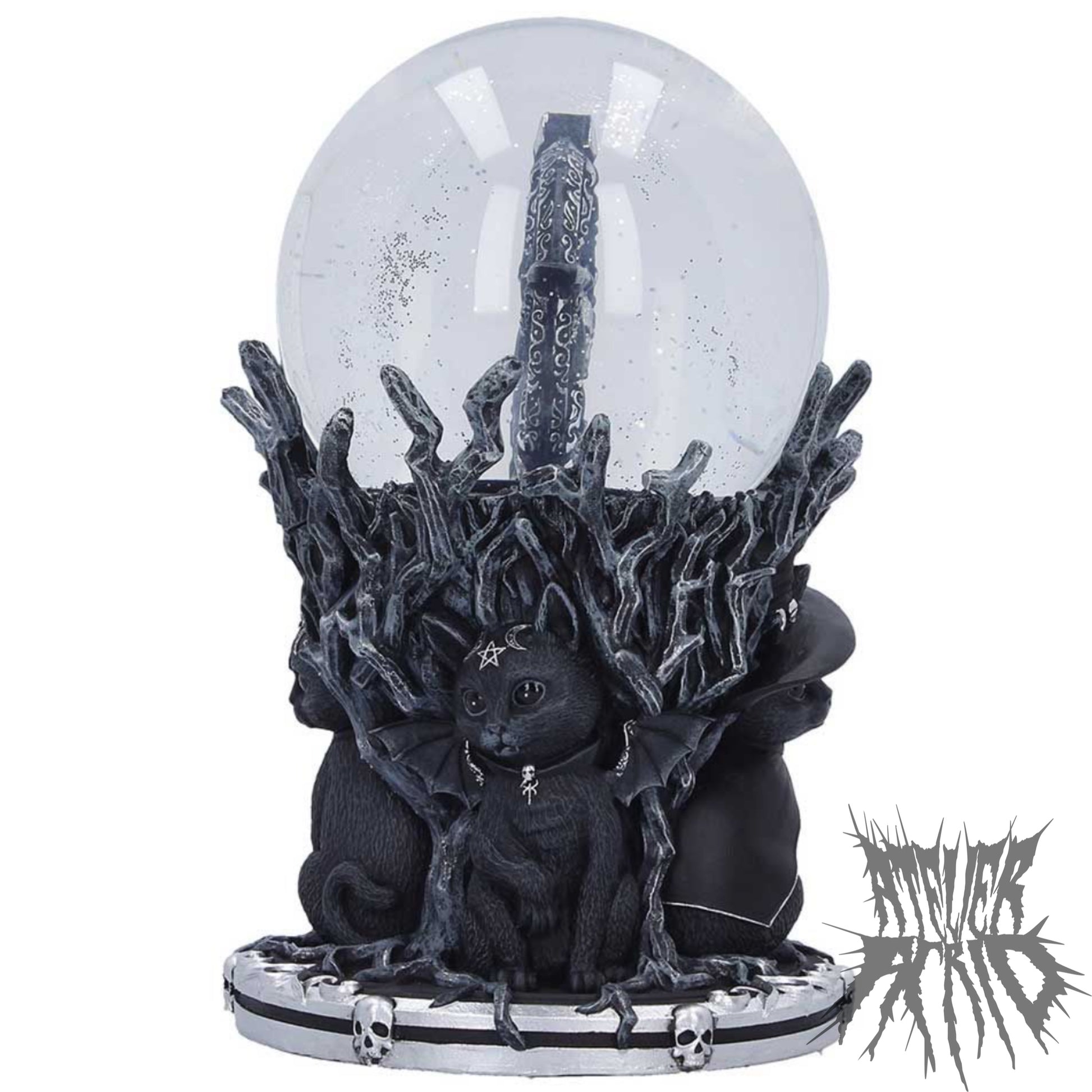 The central glass globe is filled with shimmering snow, adding a touch of eerie magic to this darkly whimsical scene.