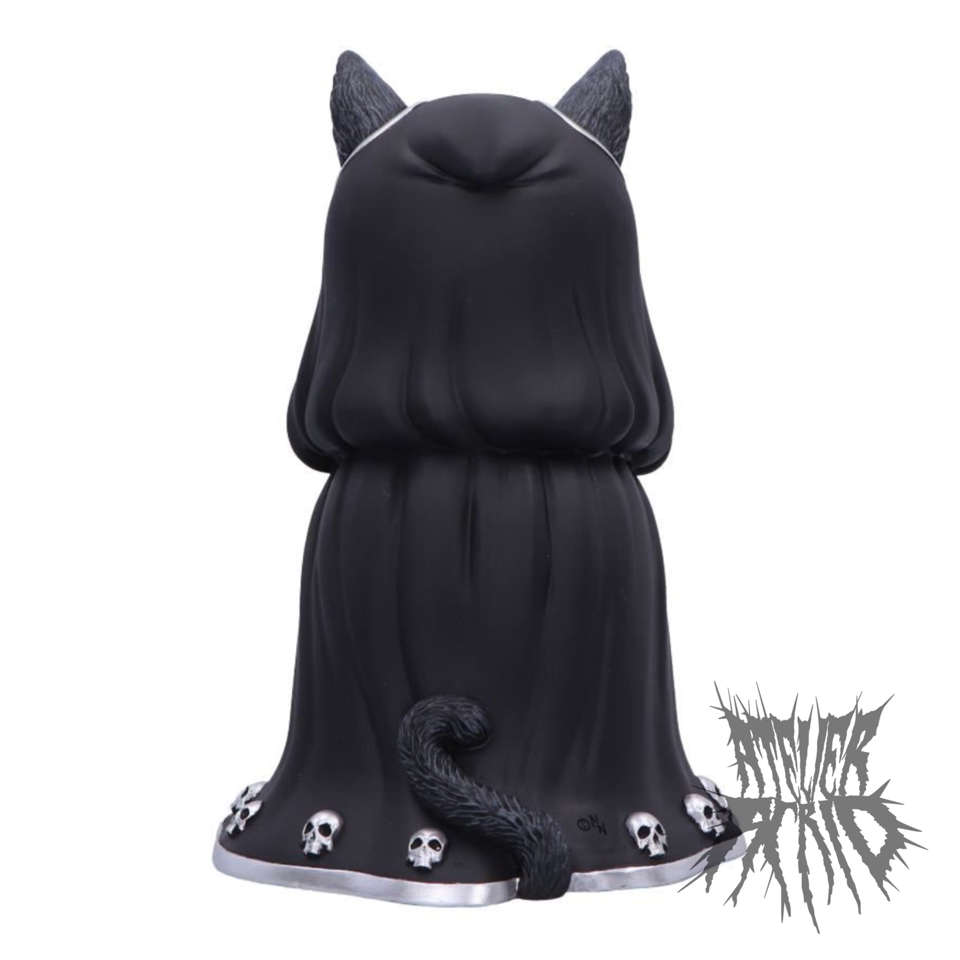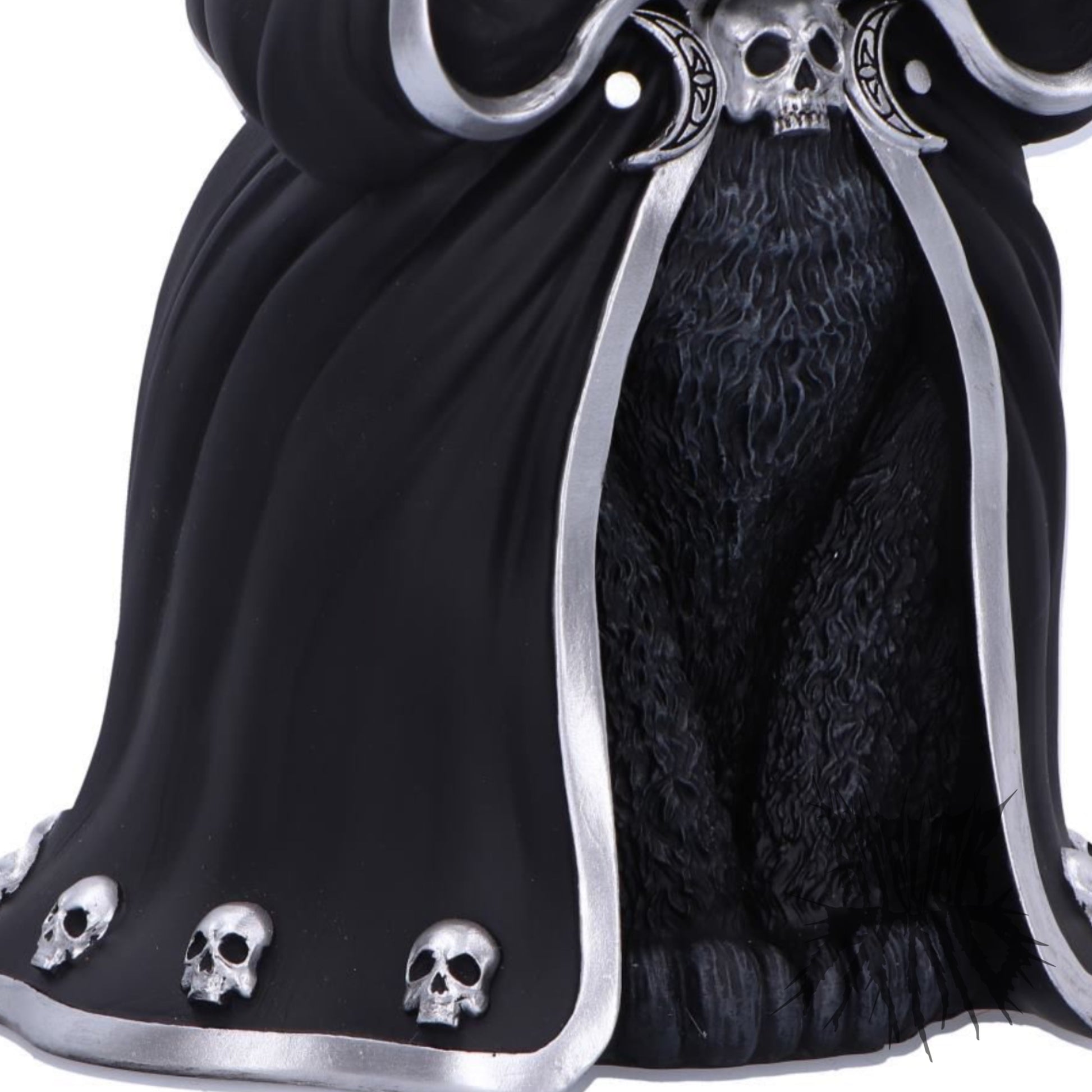 The figurine features a robed creature adorned in a flowing black cloak, decorated with intricate silver Gothic symbols and finely sculpted details.