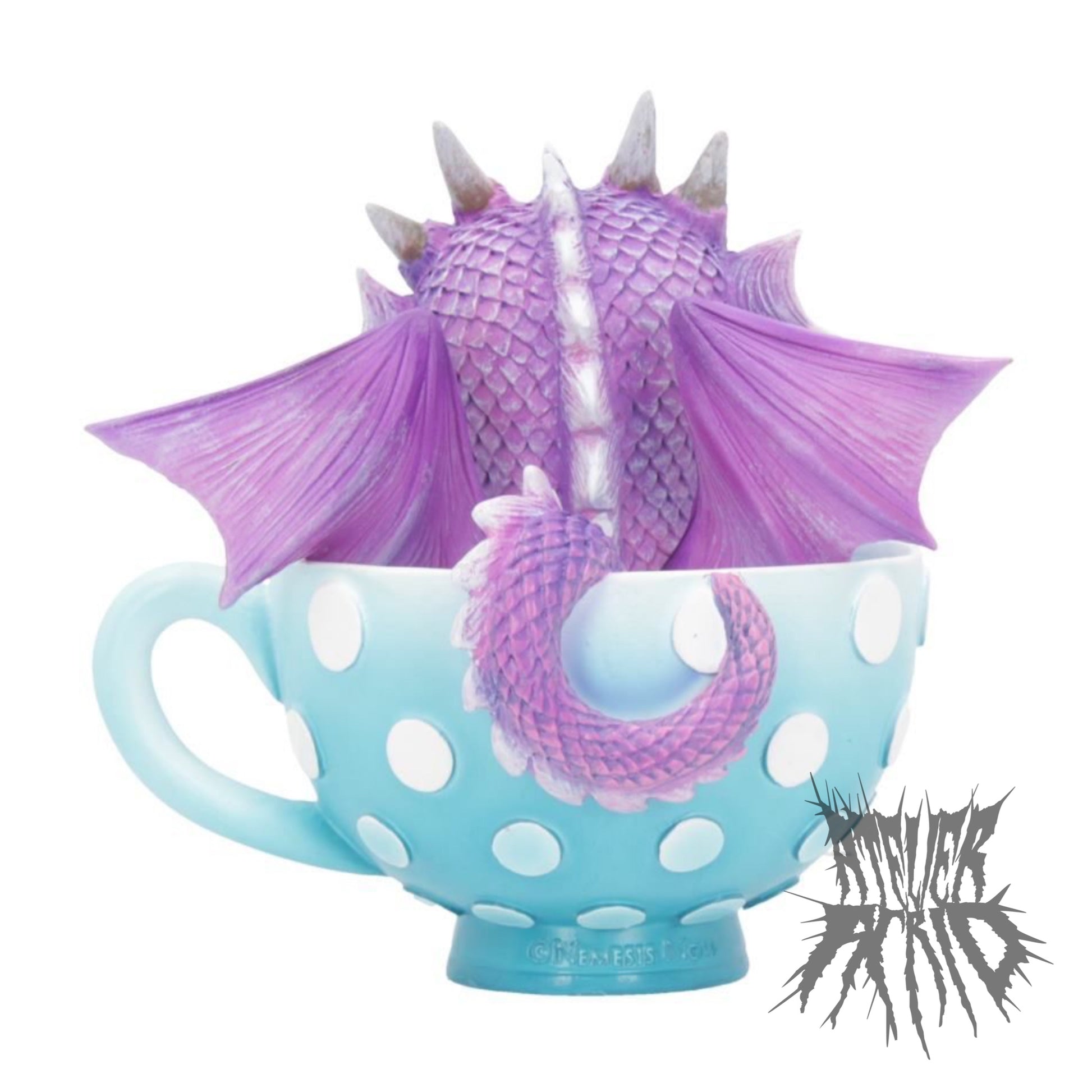 Sitting in a sky-blue polka dot teacup, this little dragon is waiting for you to take them home.