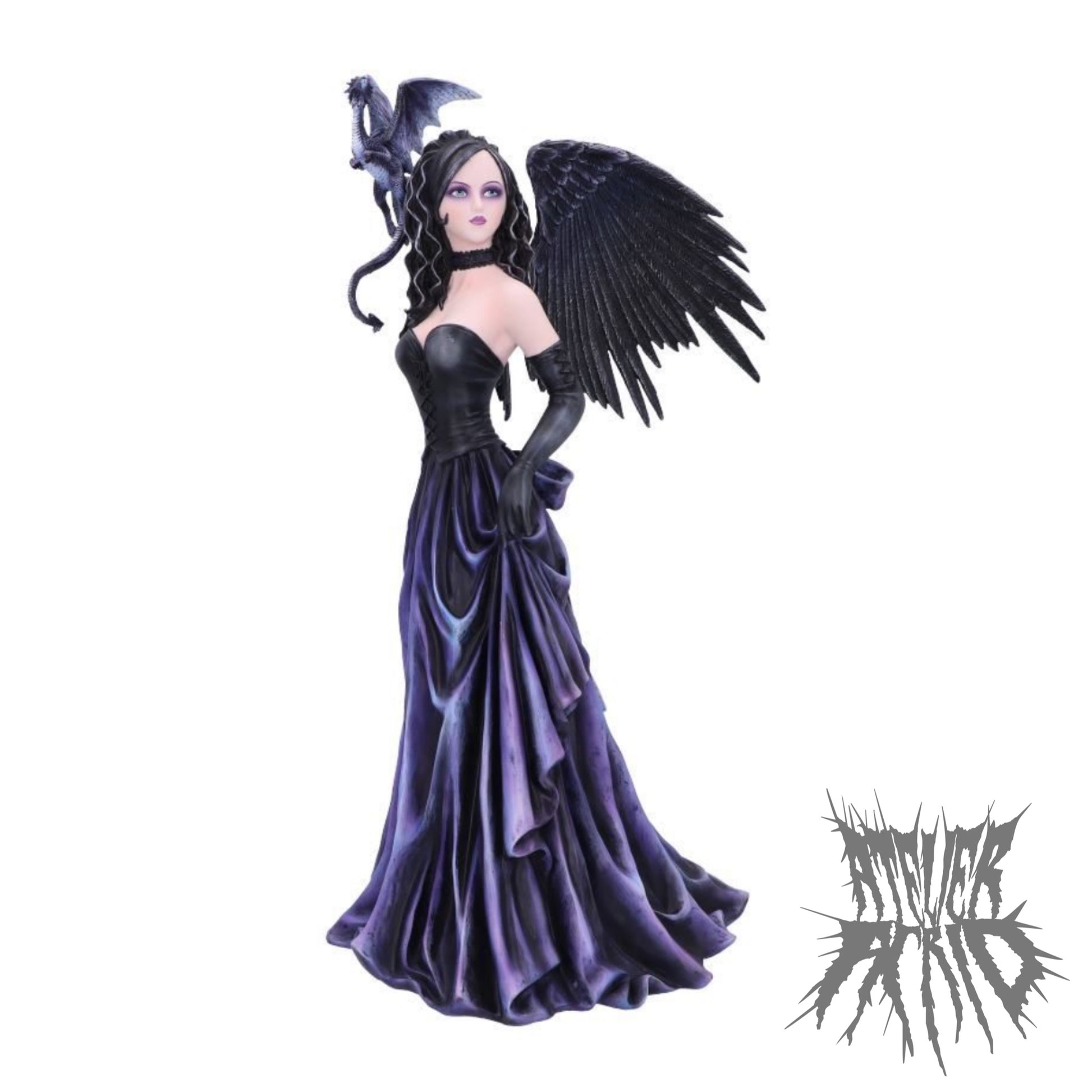Fia: This intimidating mistress of the night stares at you with long black hair with highlights of silver. Her black choker, bodice and matching gloves gradually fade into the long flowing violet dress. A grey Dragonling perches on her shoulder, wings raised in preparation for what's to come. Cast in top-quality resin before being painstakingly hand-painted, this figurine adds an air of alternative enchantment to any home.