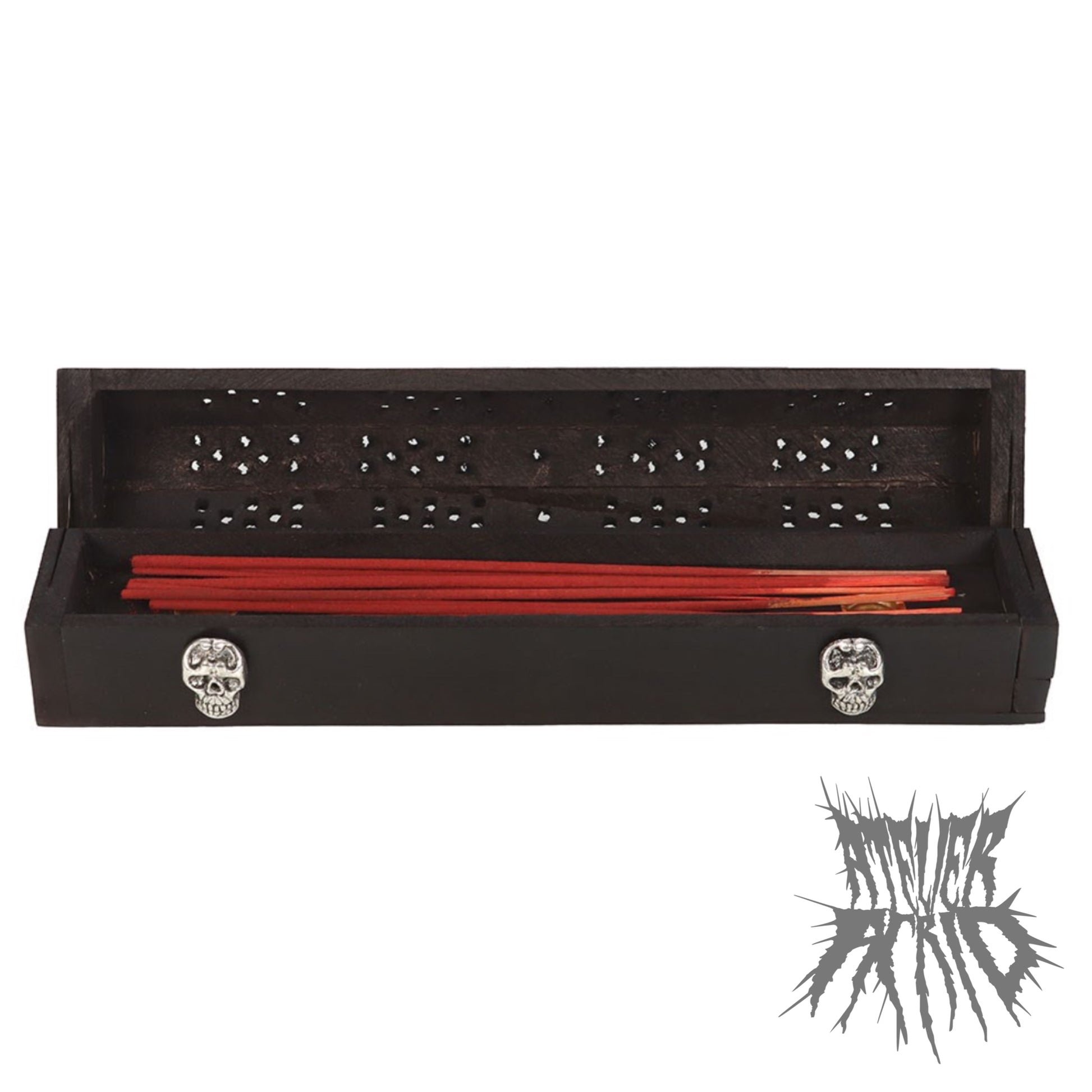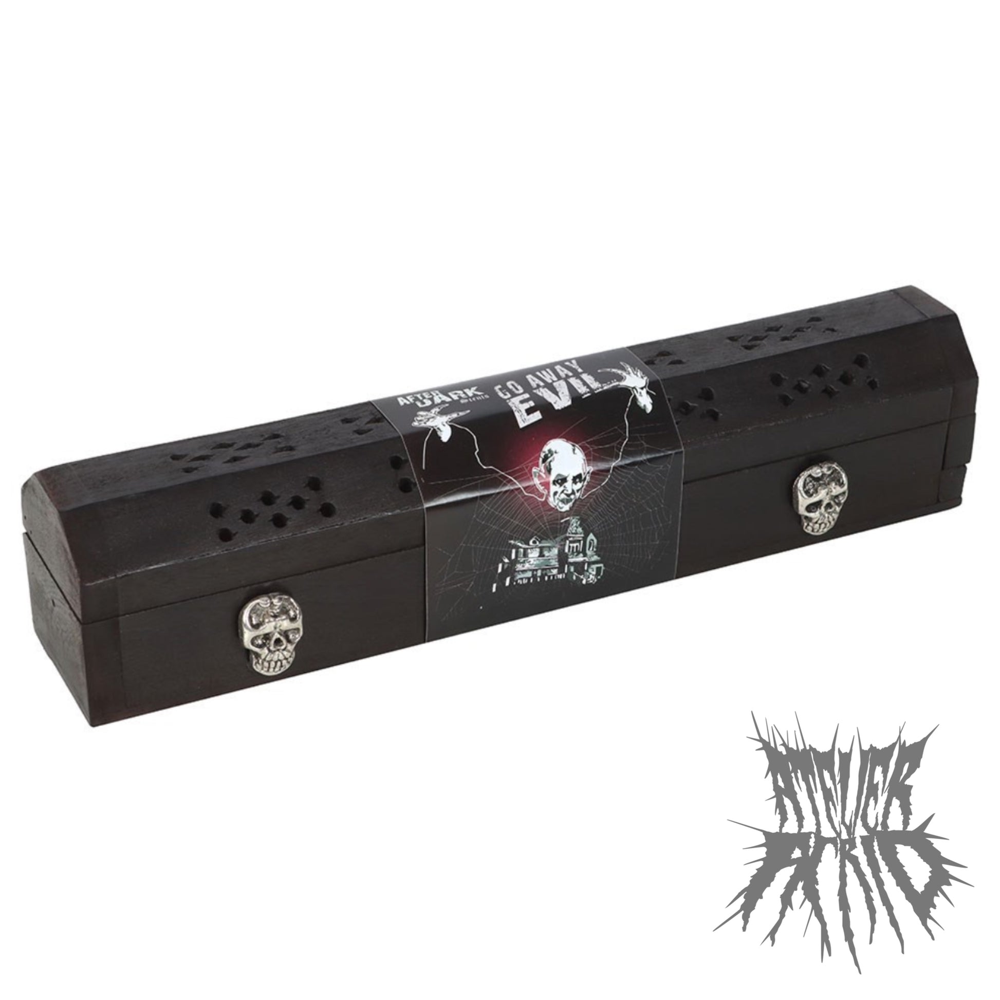 Ward off unwanted spirits with this Go Away Evil incense box set. Includes 10 rose-scented incense sticks, providing an uplifting floral fragrance for keeping demons at bay. Accented with silver skulls, the wooden box doubles as both an incense holder and storage. A perfect set for adding a touch of excitement to your favourite dark hideaway. Part of the After Dark collection of gothic home fragrance accessories.