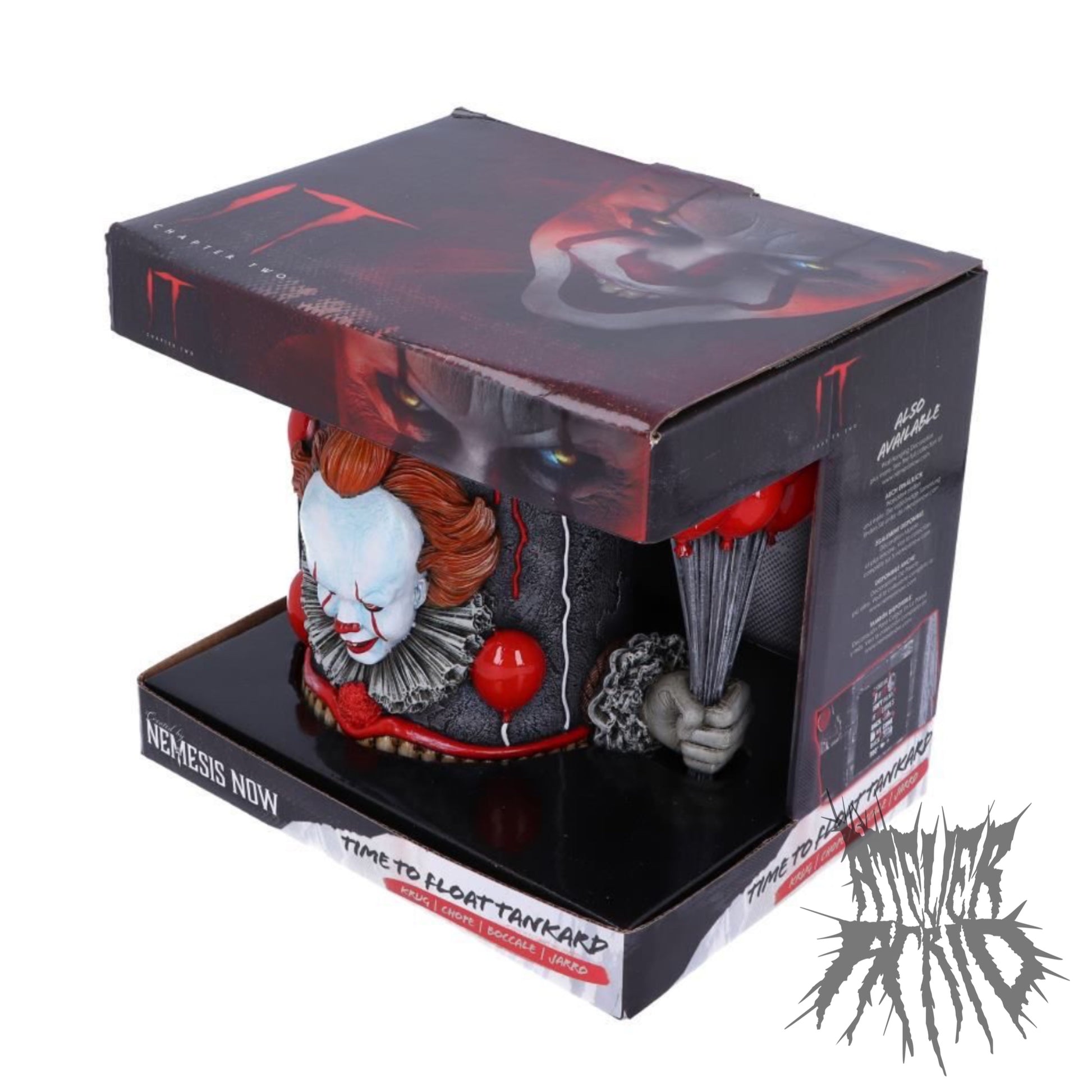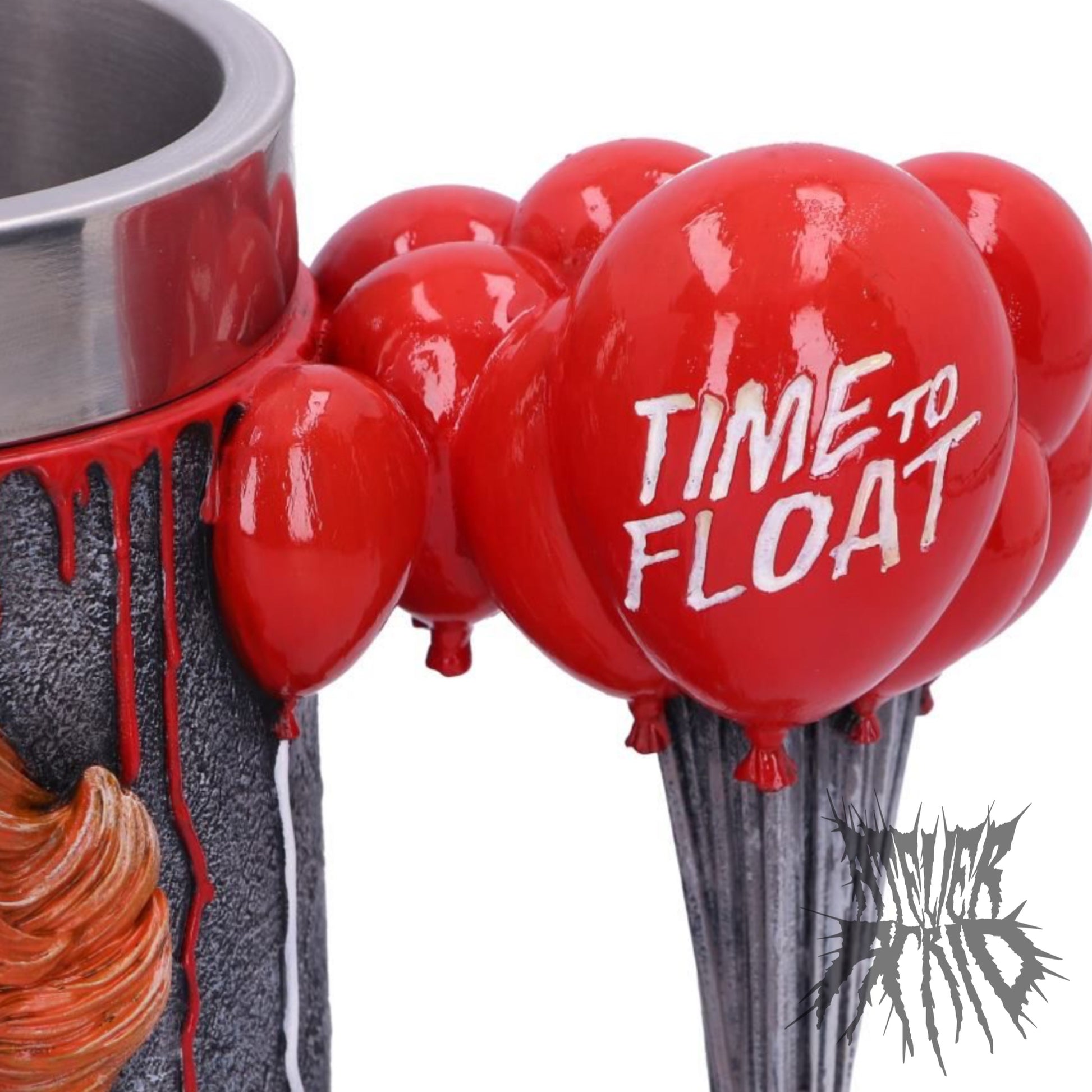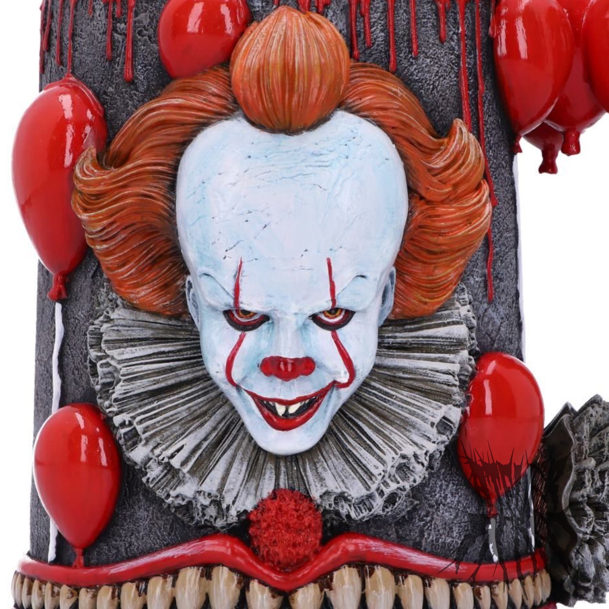 Prepare to face your fears with Nemesis Now's killer and officially licensed IT Time To Float Collectible Tankard. The front of the tankard features Pennywise himself, leaning forward in his recognisable clown suit, looking up at you with his haunting yellow eyes and an evil smirk. Surrounded by red balloons which go around the entirety of the tankard. On the handle of the cup, Pennywise's hand can be seen gripping onto a collection of red balloons, featuring the famous quote "Time to float"
