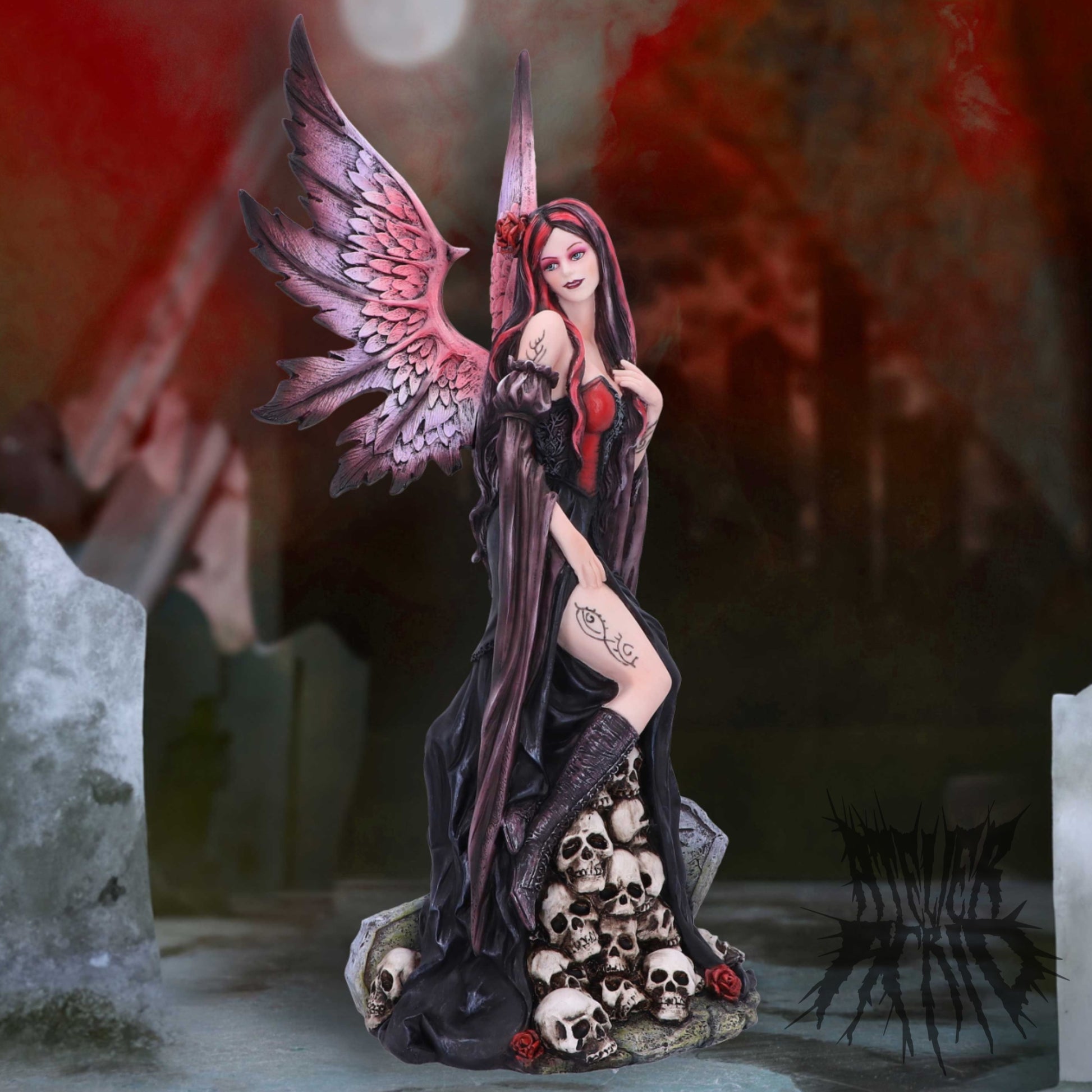 Embrace the dark allure of our Rose Fairy Figurine. Cloaked in captivating black and red attire, she sits upon a pile of skulls, exuding an air of mystique. A daring slit in her dress reveals a tantalizing tattoo, adding an element of intrigue. Cast in the finest resin before being expertly hand-painted, this breathtaking figurine is the perfect piece for fantasy and fairy lovers alike!
