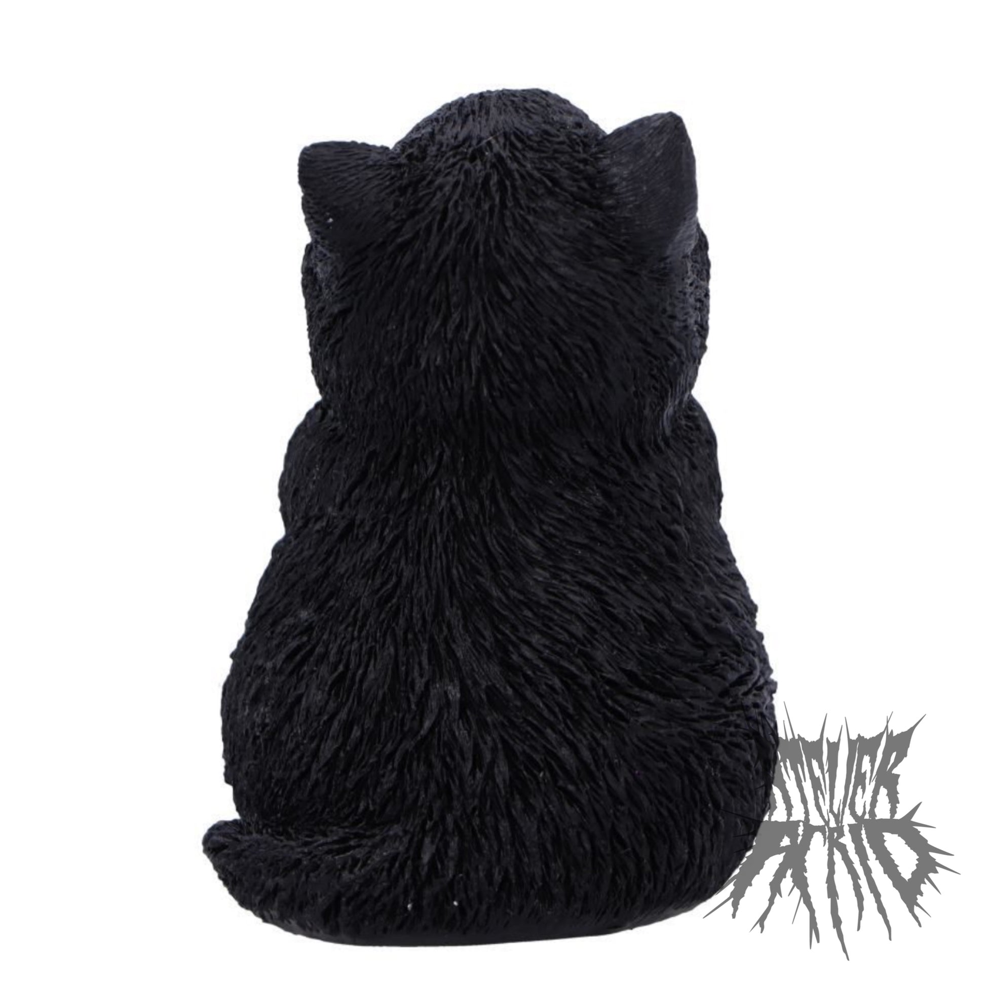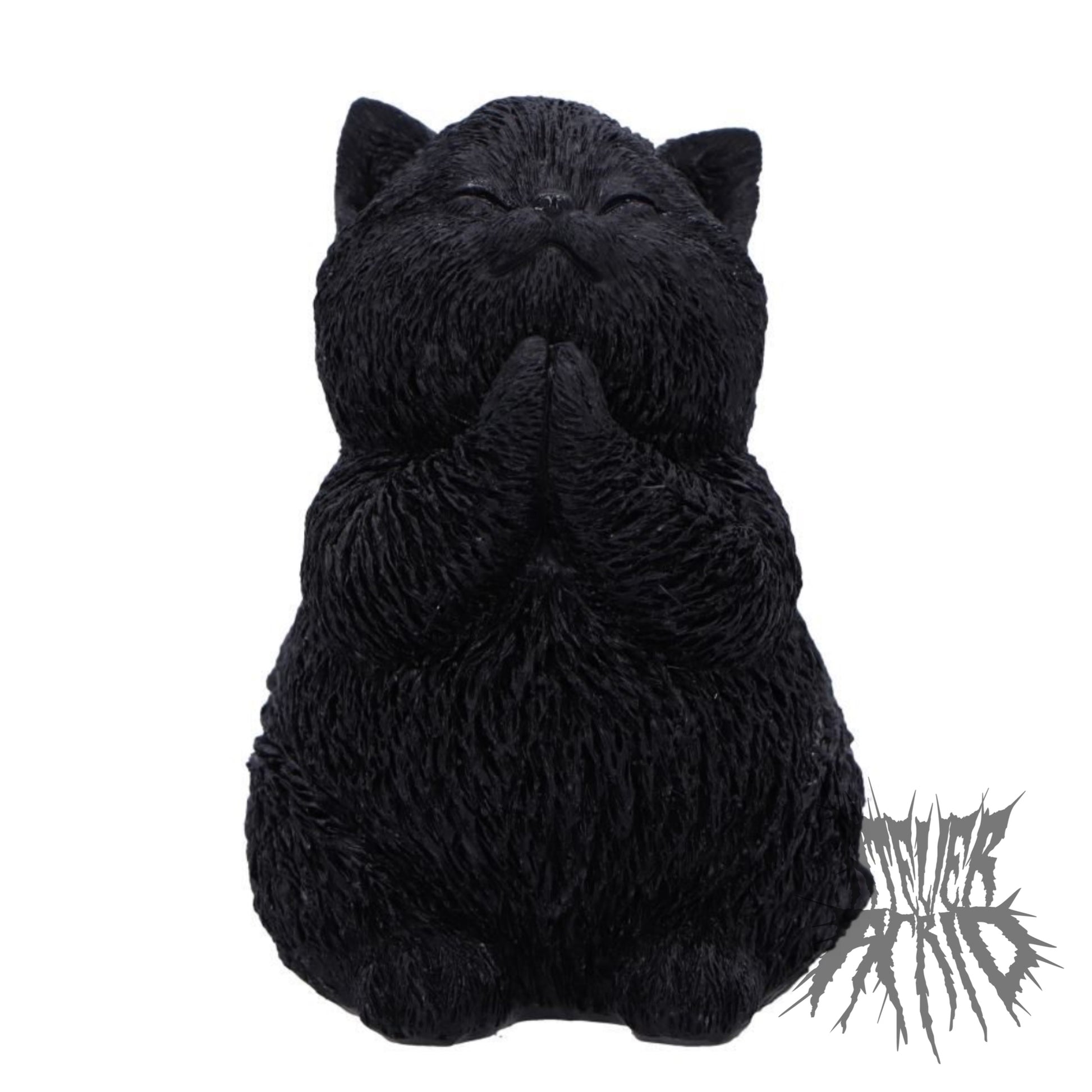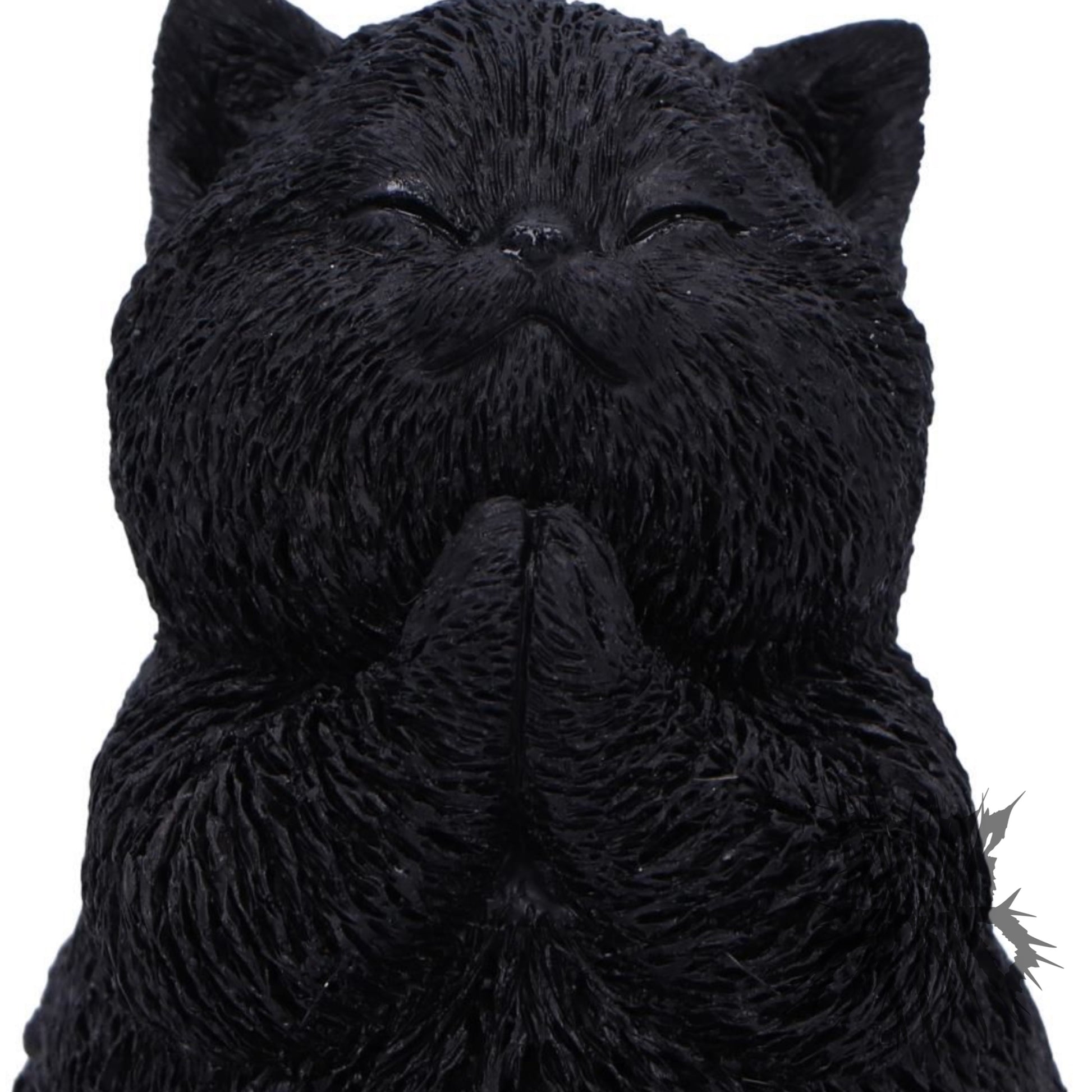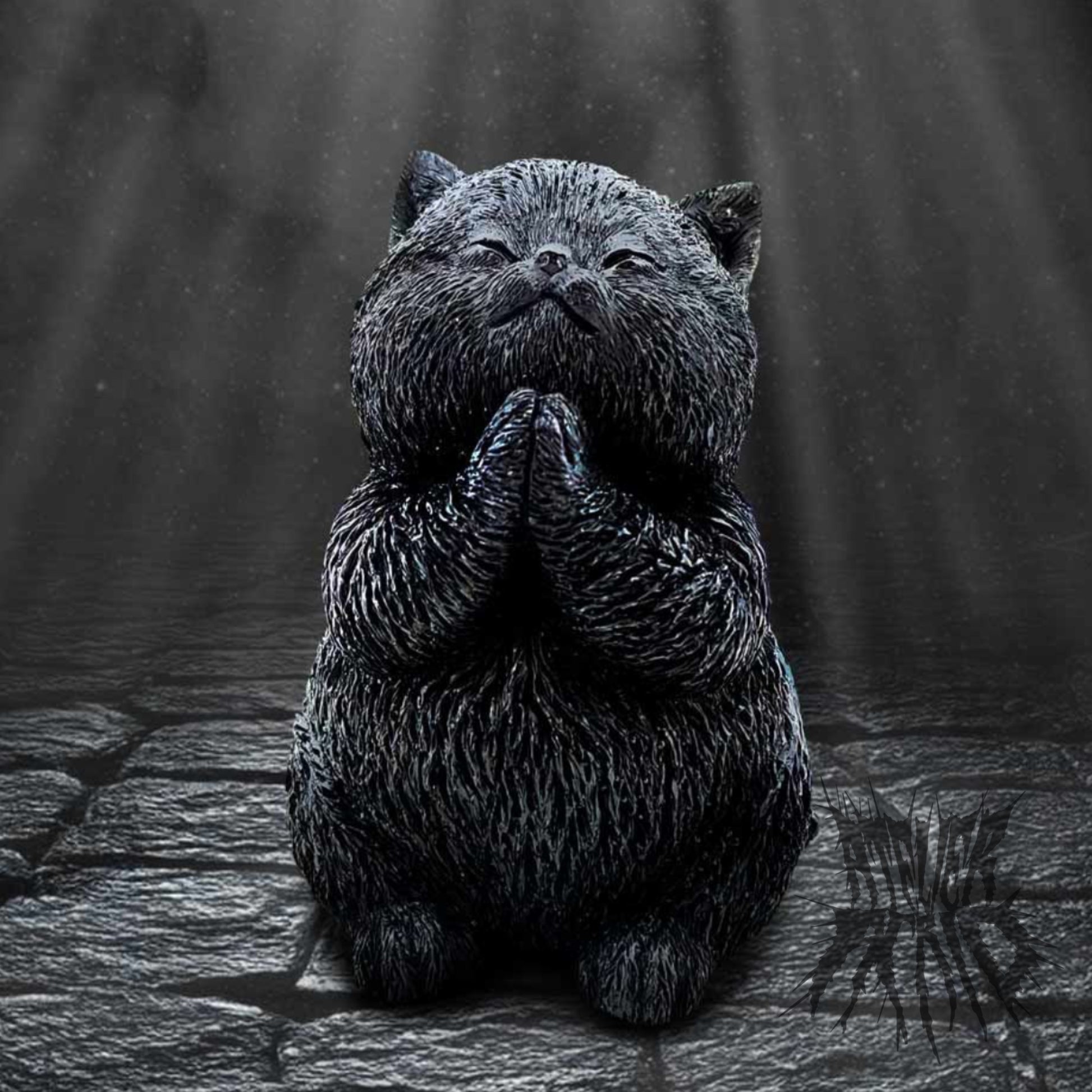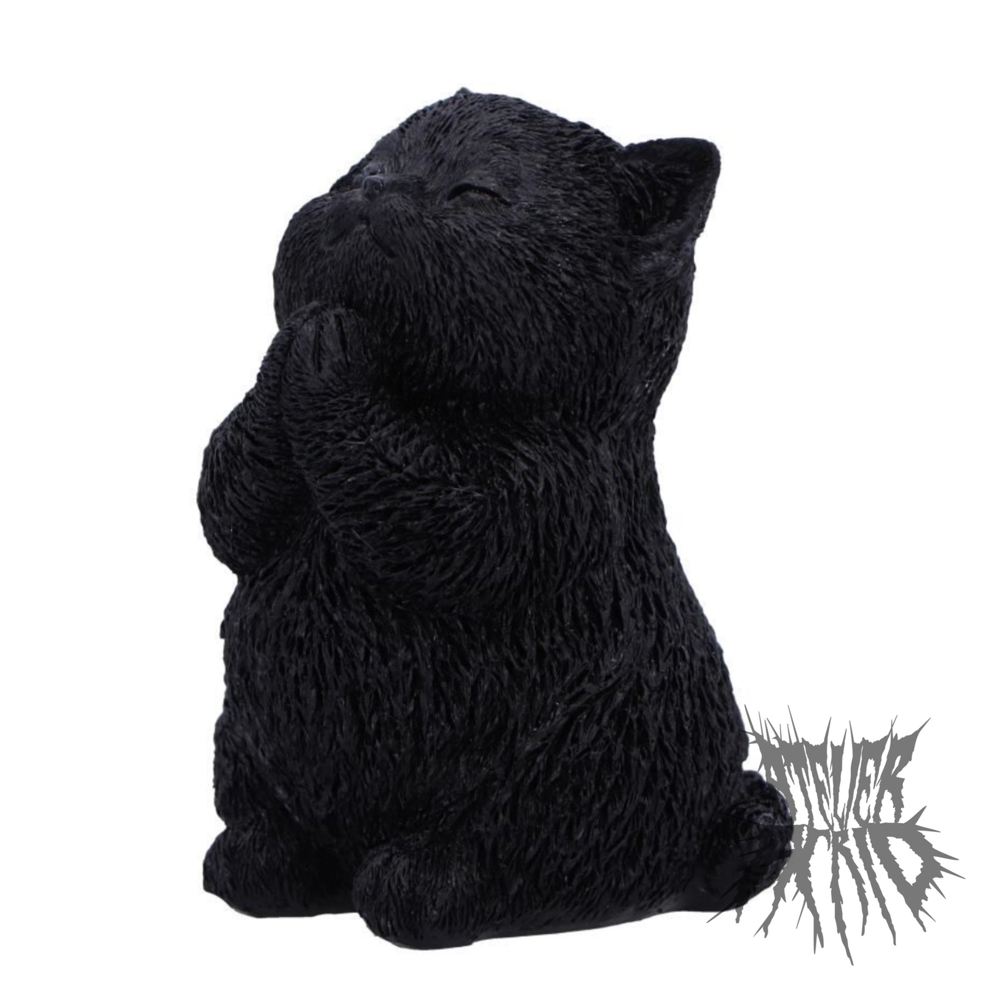 A charming black cat figurine with its eyes closed and paws pressed together in a serene, wishful pose.