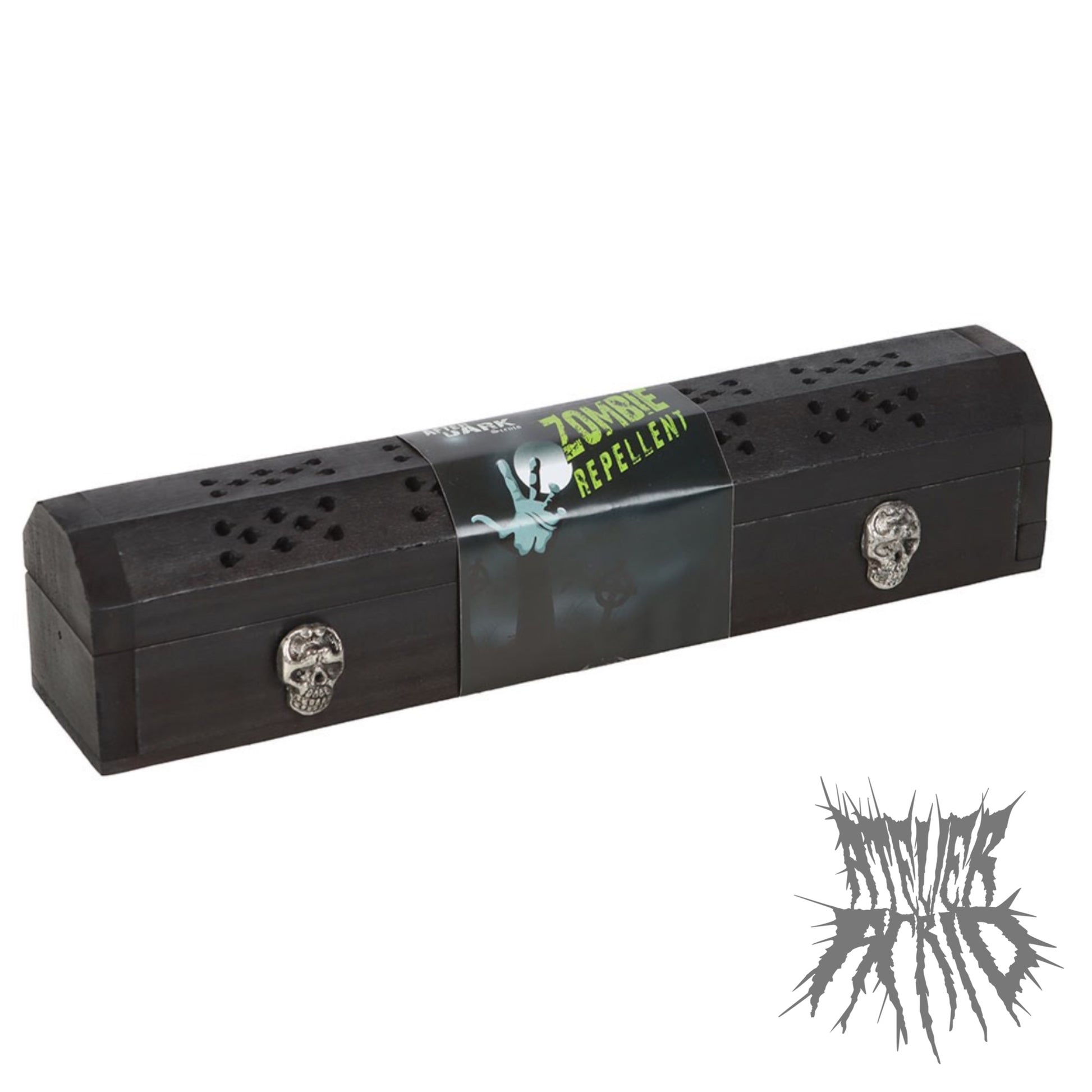 Ward off the undead with this Zombie Repellent incense box set. Includes 10 jasmine-scented incense sticks, providing a sweet floral scent for keeping mutants at bay. Accented with silver skulls, the wooden box doubles as both an incense holder and storage. A perfect set for adding a touch of excitement to your favourite dark hideaway. Part of the After Dark collection of gothic home fragrance accessories.